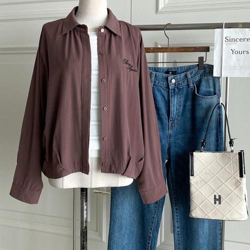[옷자락]여성 자수 글씨 레이온 루즈핏 핀턱 긴팔 블라우스
