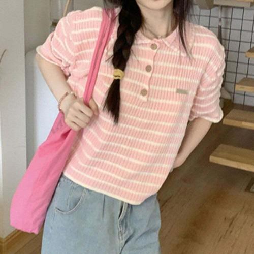 [엄지척]여자 핑크색 반팔카라티 여름 스트라이프 20대_19611267_667501