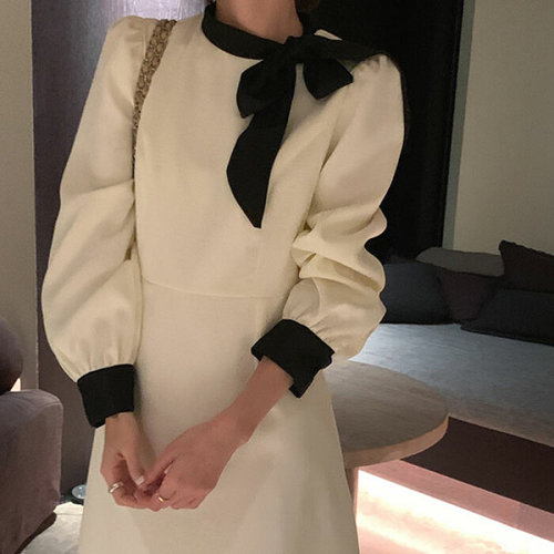 슈팅스타 / 단정 프랜치 컬러 대비 리본 하객룩 우아한 원피스