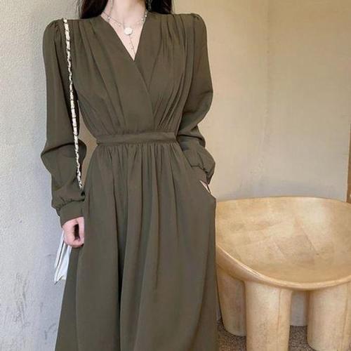 [다잇템_패션]여성용 단추 롱스판 FW 드레스 하객용 절개라인