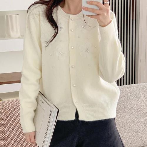 [신상오픈런]진주 라운드넥 하객룩 꽃장식 하늘색 여성 니트가디건