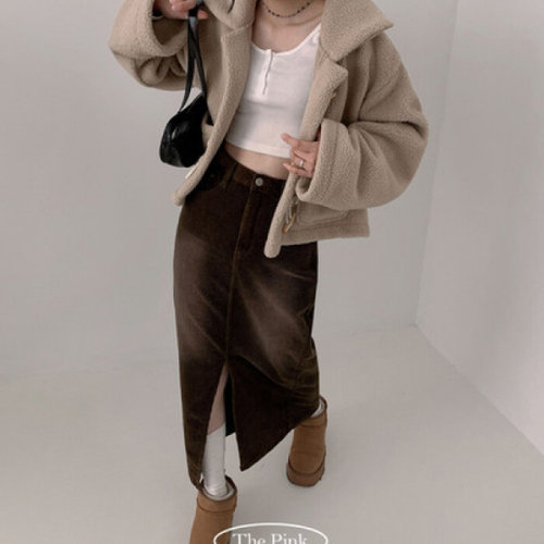 더핑크 / 벨디 하이웨스트 H라인 워싱 트임 코듀로이 롱 스커트