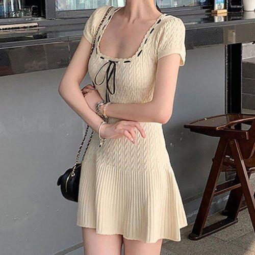 [모노무드]LMO 유넥 케이블니트 베스트스티치 타이 하프슬리브 니트미니원피스