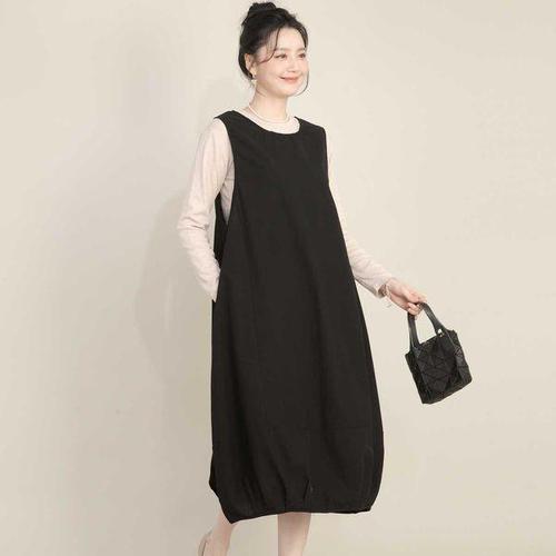[애비뉴투지]엄마옷 코튼 순 면 항아리 벌룬 주머니 라운드 여성 봄 가을 네츄럴 롱 조끼 원피스 K09553