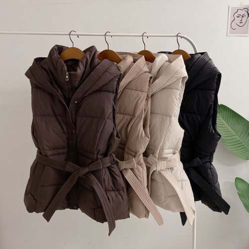 허니제이 / 벨트세트 마드엔 이중 후드 하이넥 퀼팅 패딩 조끼(4color)