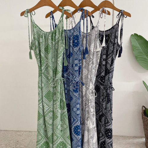 허니제이 / 휴캉 페이즐리 테슬 리본끈 나시 롱 원피스(4color)