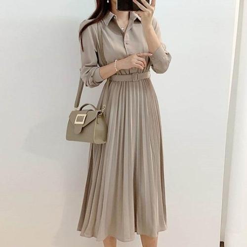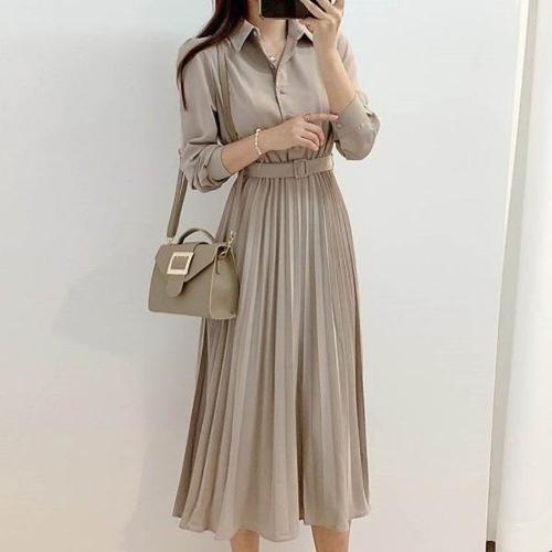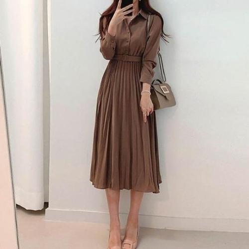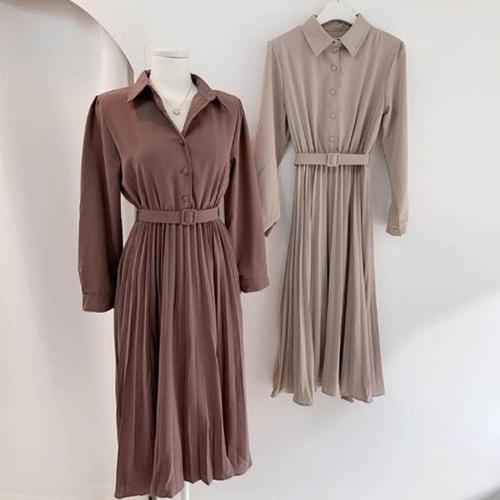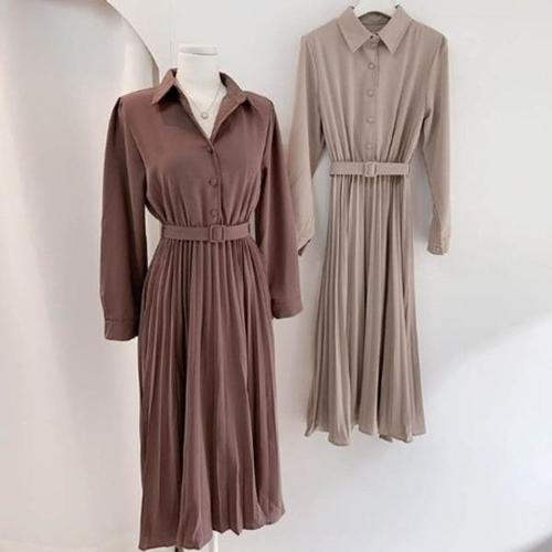 [엄지척]여성 하객패션 플리츠 카라 허리 벨트 롱 주름 원피스_19953249_667501