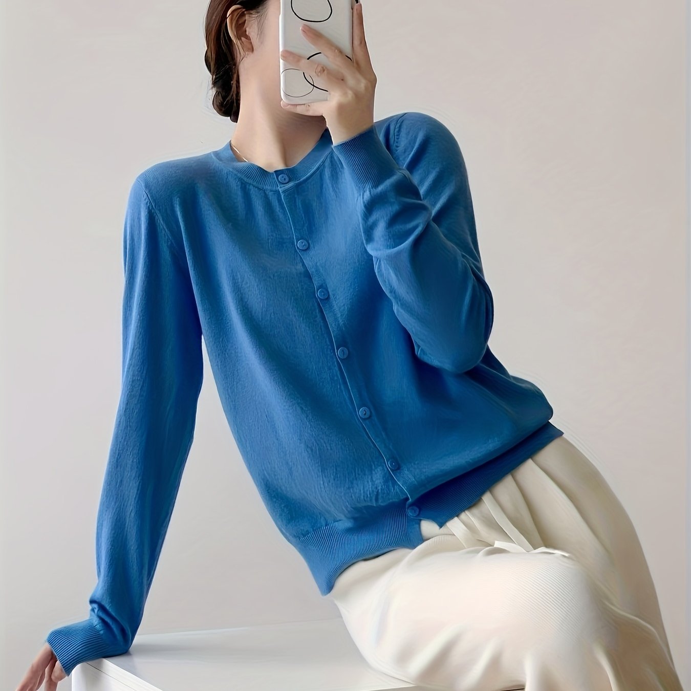 TEMU 여성용 우아한 터키스 블루 가디건 스웨터 - 부드러운 긴 소매 라운드넥 버튼 프론트 재킷, 사계절 활용 가능한 스타일 코트, 캐주얼 & 포멀 웨어용 주름 방지 레이어링 아이템