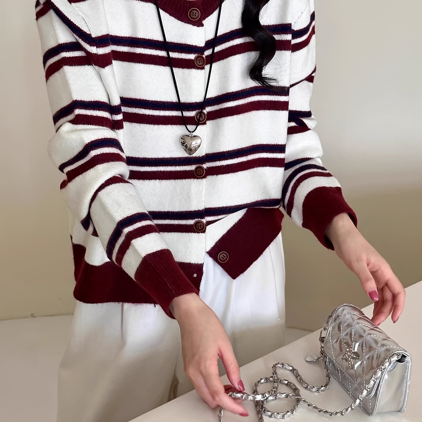 TEMU 여성용 소프트 & 클래식 가디건 - 긴 소매, 단추 디자인, 라운드 넥, 가벼운 봄/가을 아우터웨어, 브라운 & 화이트 수직 줄무늬, 캐주얼 스타일, 캐주얼 웨어 카디건