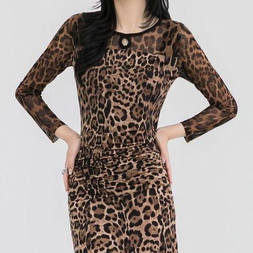 [신상오픈런]여성 호피 플리츠 라운드넥 시스루 가을 긴팔 블라우스