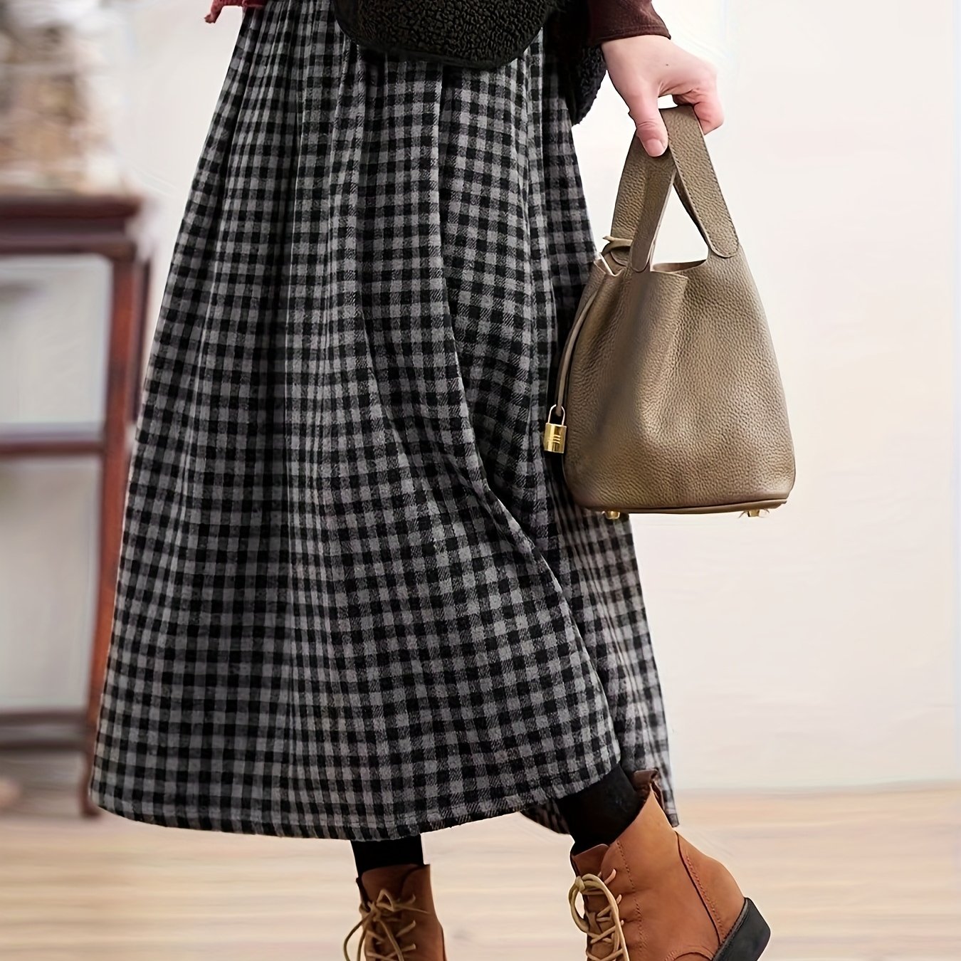 TEMU 여성 빈티지 체크 스커트 - 하이웨이스트 미디 기장 겨울 스커트, 옆면 포켓, 가을/겨울용 두꺼운 따뜻한 원단, 체크 패턴, 캐주얼~시미포멀 웨어, 겨울 스커트, 시즌 패션, 클래식 스타일, 고품질 스티칭, 라인댄스 스커트, 여름 스커트, 하이웨이스트 스커트, 우아한 스커트, 플리츠 스커트, 여성 스커트