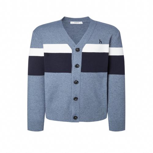 헤지스 남성 틸블루 소매 배색 울 이중직 라운드 가디건 (HZSW4D200E3)