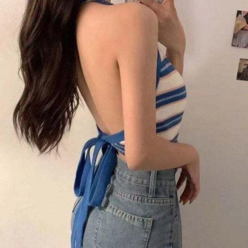[셀럽하우스]여성 SXCT7566 여름 데일리 홀터넥 스트라이프 크롭 민소매 티