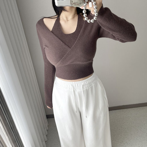 [신상오픈런]여성 가을 홀터넥 브이넥 크롭 슬림 니트 탑