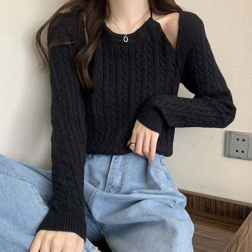 [셀럽하우스]꽈배기 IQWK7777 짜임 패턴 여성 홀터넥 볼레로 긴팔 니트