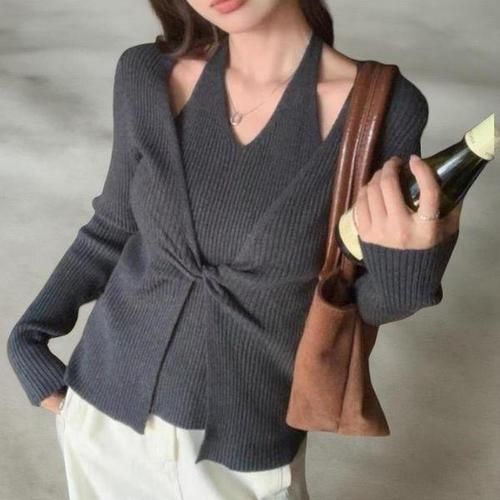 [신상오픈런]여성 홀터넥 레이어드 브이넥 꼬임 니트 가디건