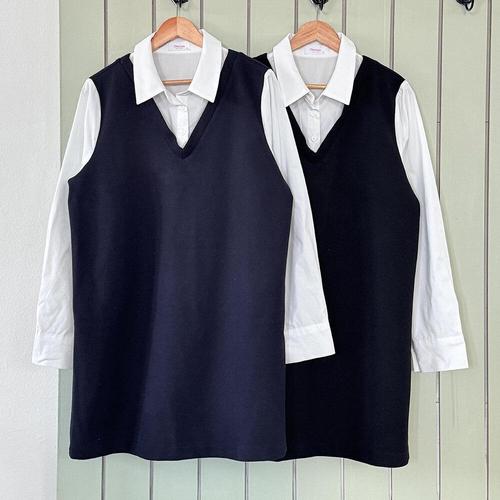 [옷자락]여성 하객용 흰 셔츠형 레이어드 브이넥 미디 원피스