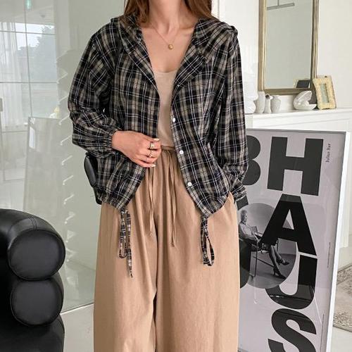 [쥬니브]미레스 포켓 체크무늬 후드 긴팔 블라우스