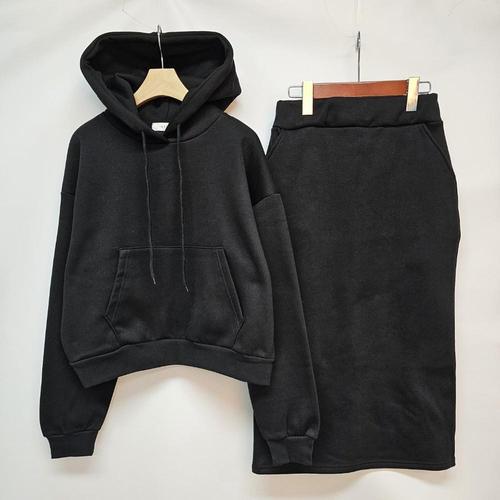 [샵앤][샵앤] 국산 여성 기모 후드 티셔츠 롱스커트 셋업 LL-WSET-5008-블랙