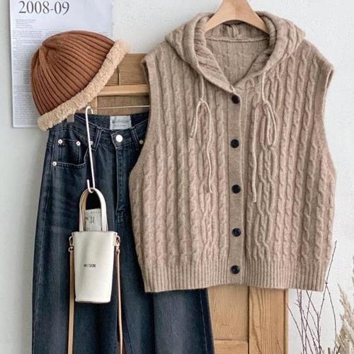 [다잇템][다잇템] 여성 꽈배기 캐쥬얼 스웨터 후디 조끼 버튼 드로우코드 포함_23287603_588872