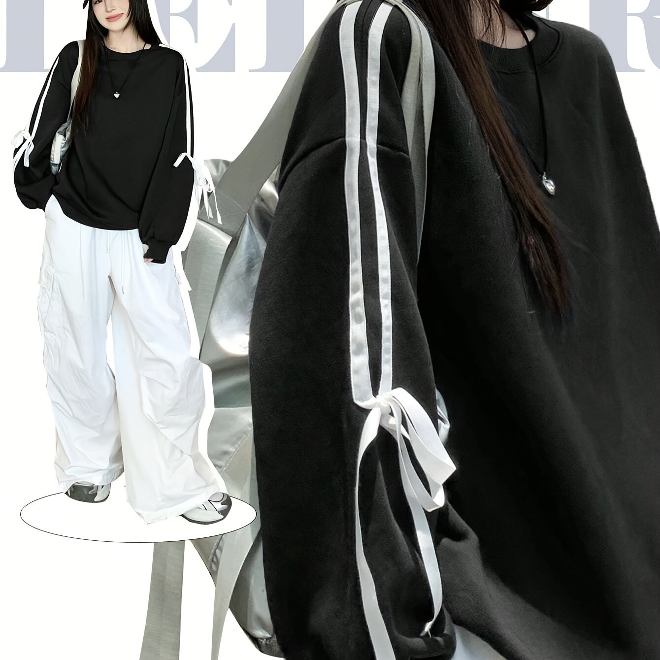 TEMU 여성용 루즈핏 라운드넥 컬러 블록 웨빙 리본 얇은 캐주얼 스웨트셔츠