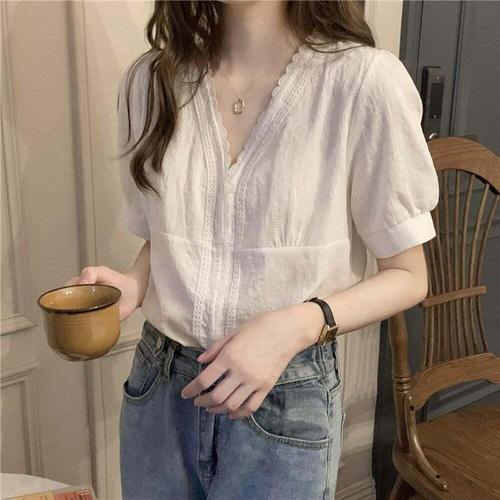 [셀럽하우스]브이넥 UBBB6061 레이스 화이트 하얀 블라우스 반팔셔츠
