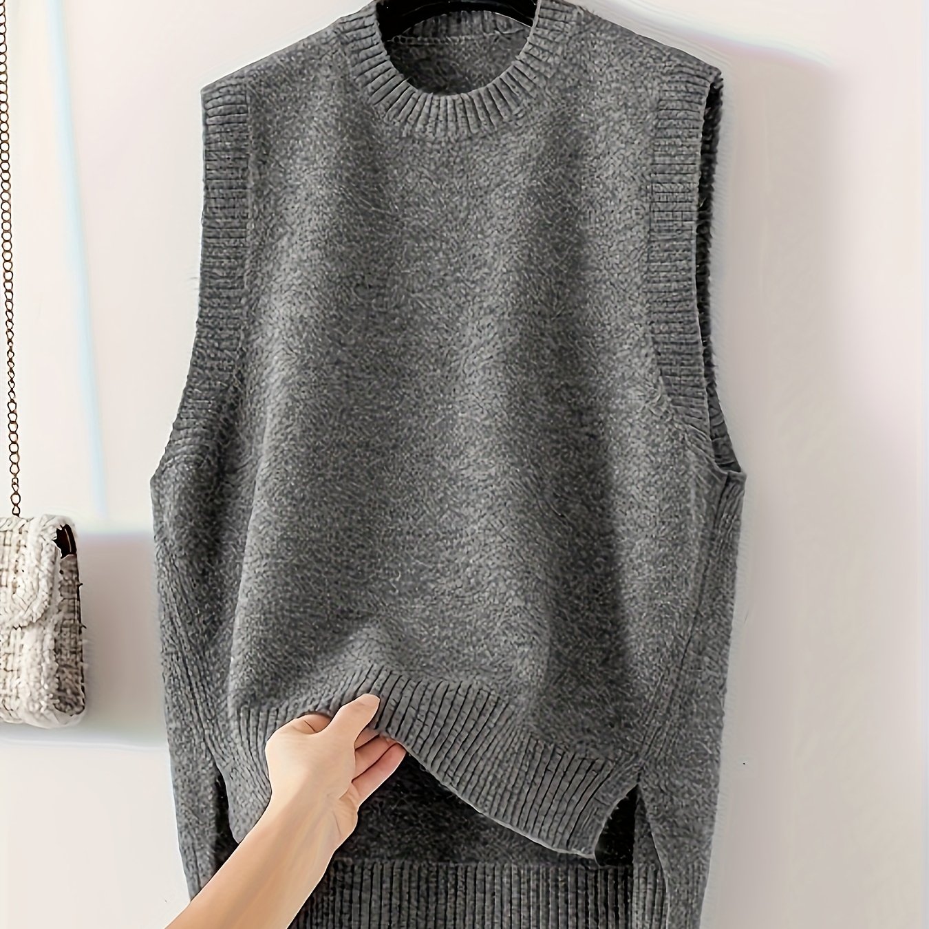 TEMU 여성용 우아한 민소매 니트 조끼 - 미디엄 길이, 루즈핏 사이드 슬릿, 크루 넥, 리브 텍스처, 솔리드 그레이, 캐주얼 또는 시크한 룩에 완벽, 다용도 의류, 크루 넥 베스트