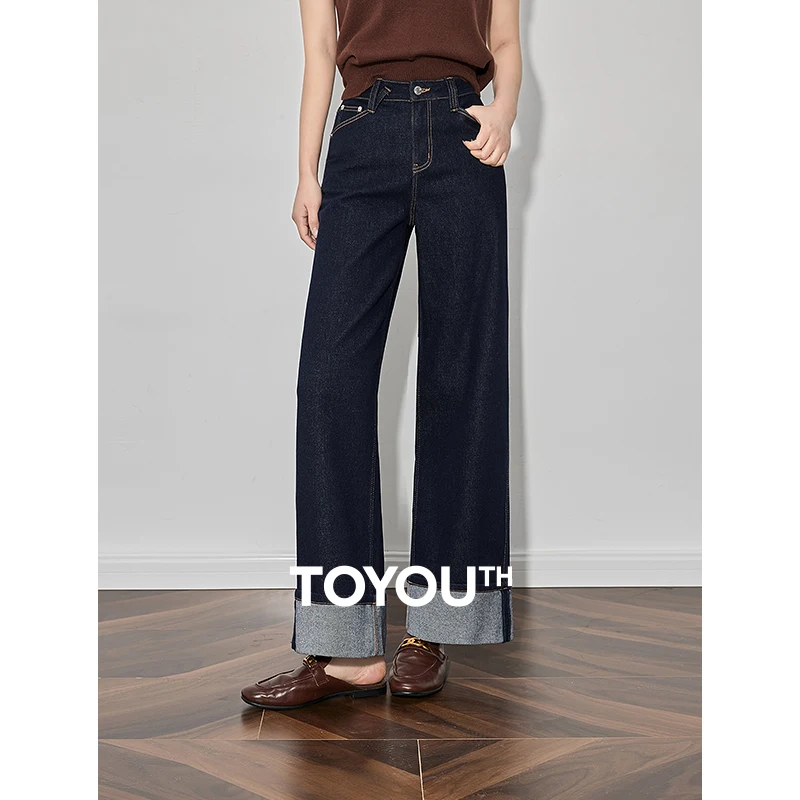 TOYOUTH 여성 데님 청바지 2025 봄 새로운 유행 롤업 밑단 스트레이트 와이드 레그 팬츠
