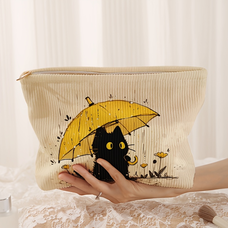 TEMU 만화 우산 고양이 패턴 프린트 코듀로이 지퍼 메이크업 가방, 가벼운 메이크업 가방, 메이크업 가방, 내부 안감이 있는 다기능 화장실 가방