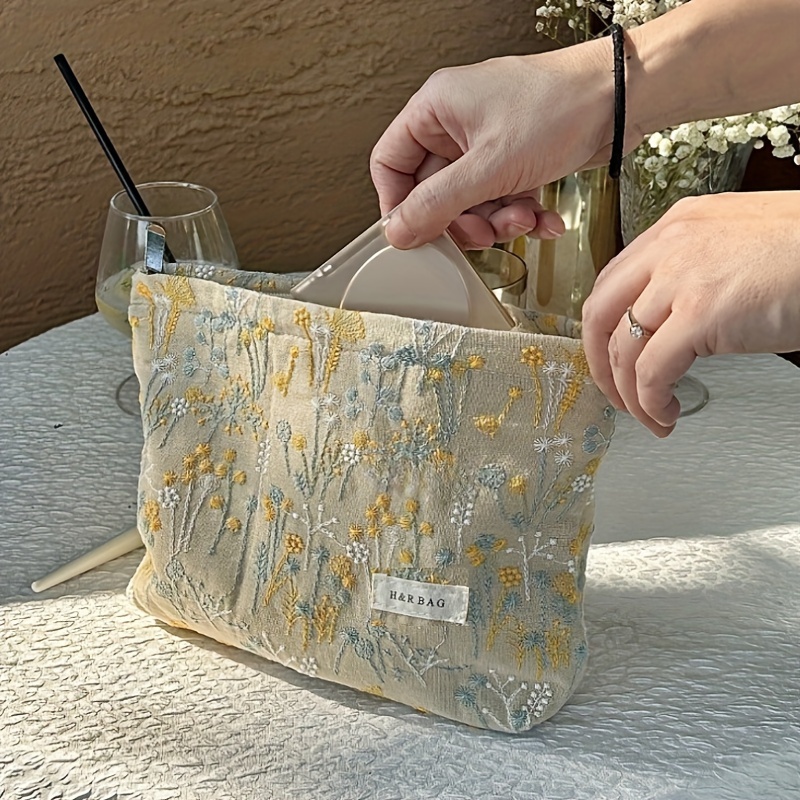 TEMU 1개 - 식물 자수 메이크업 가방 휴대용 캔버스 보관 가방 립스틱 워시 가방
