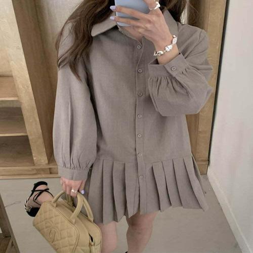 슬림소녀 여성용 여름 슬림 셔링 긴팔 캐주얼 셔츠 미니 원피스