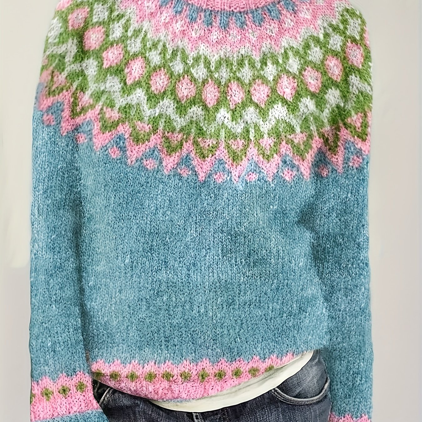 TEMU 페어 아일 자카드 라운드넥 스웨터, 여성 캐주얼 패션 긴팔 다용도 빈티지 자카드 스웨터 가을 겨울용