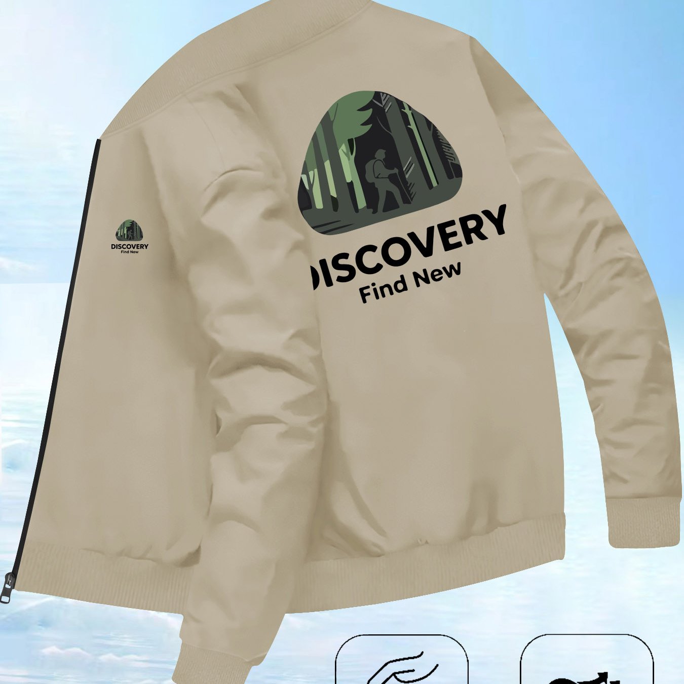 TEMU 남성용 슬림핏 봄버 재킷 - 스탠드 칼라 & 익스플로러 프린트, 지퍼 겨울 코트, 세탁기 사용 가능, 캐주얼 & 아웃도어 착용용 포켓 (가을/겨울) - 젊은 남성을 위한 스타일리시 아우터웨어