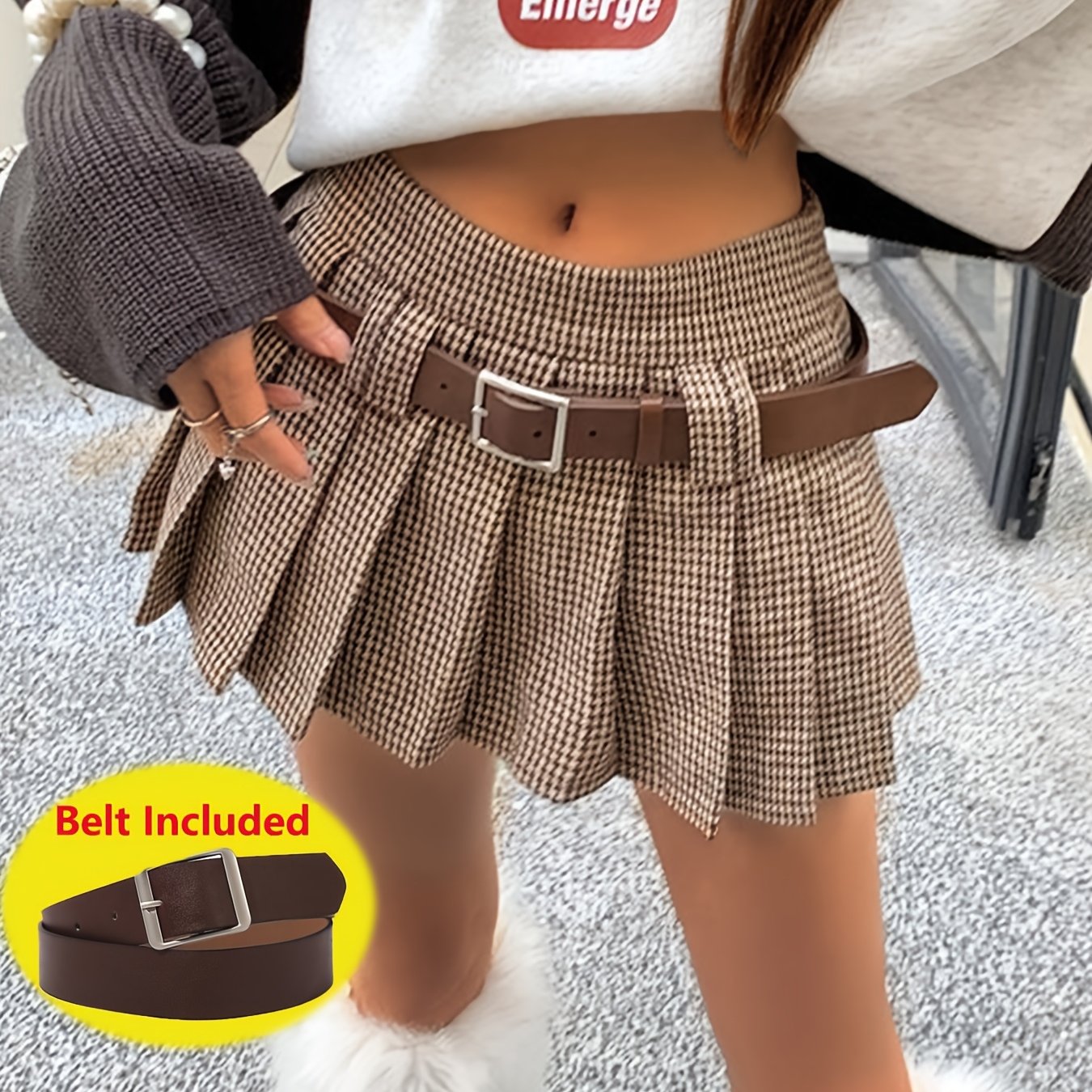 TEMU ZJ0926038 가을/겨울 여성 빈티지 하운드투스 패턴 하이웨이스트 A라인 플리츠 스커트, 브라운 벨트 포함, 캐주얼 포멀 숏 스커트, 스파이시 록 스커트
