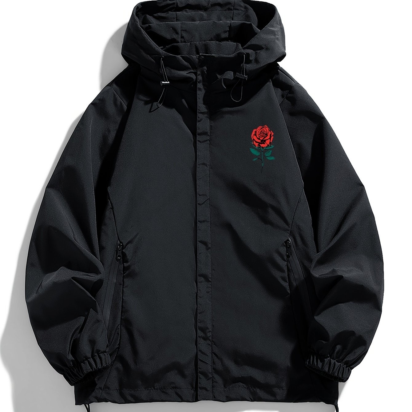 TEMU 남성용 캐주얼 후드 재킷 - 봄과 가을을 위한 내구성 있는 폴리에스터, 지퍼 업 봄버, 빨간 꽃 디자인으로 블랙 컬러, 캐주얼 아우터웨어 | 트렌디한 남성용 재킷 | 세련된 블랙 재킷