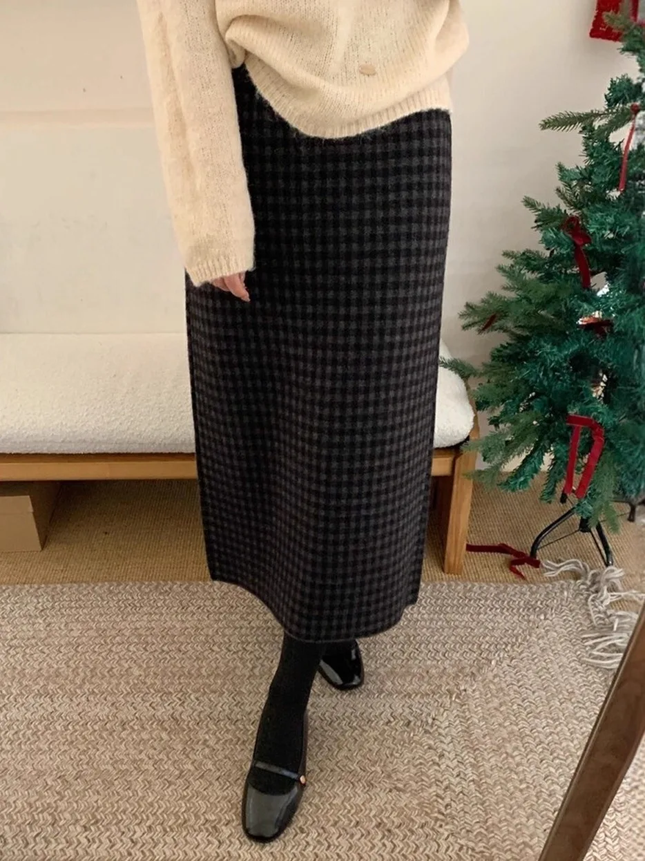 하이웨이스트 체크 울 미니스커트 여성용 가을 겨울 슬림 A라인 랩 스커트 긴팔 출퇴근 한국 스타일