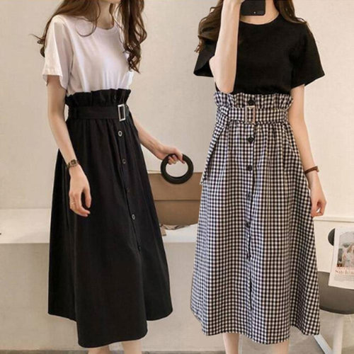 [옷자락]여성 무지 반팔티 벨티드 a라인 스커트 투피스 세트