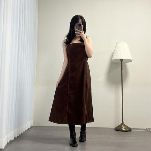 [옷자락]여자 스웨이드 스티치 A라인 가을하객룩 끈 롱원피스