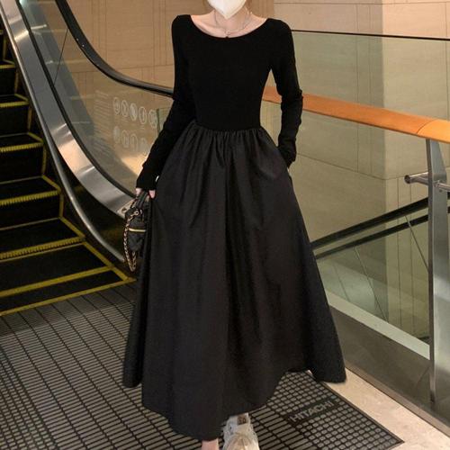 기장 배색 미디 여자 니트원피스 라운드 A라인 반팔 WFLOZRW