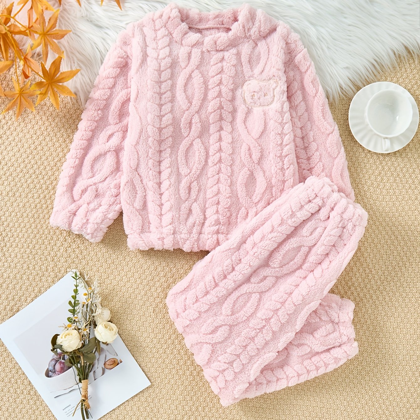 TEMU 포근한 아동용 플러시 세트 - 양면 플리스 따뜻함, 자수 디테일, 긴소매 크루넥 풀오버 및 바지 (남아 여아 공용) - 겨울 필수템, 야외 활동용, 여아용 겨울옷