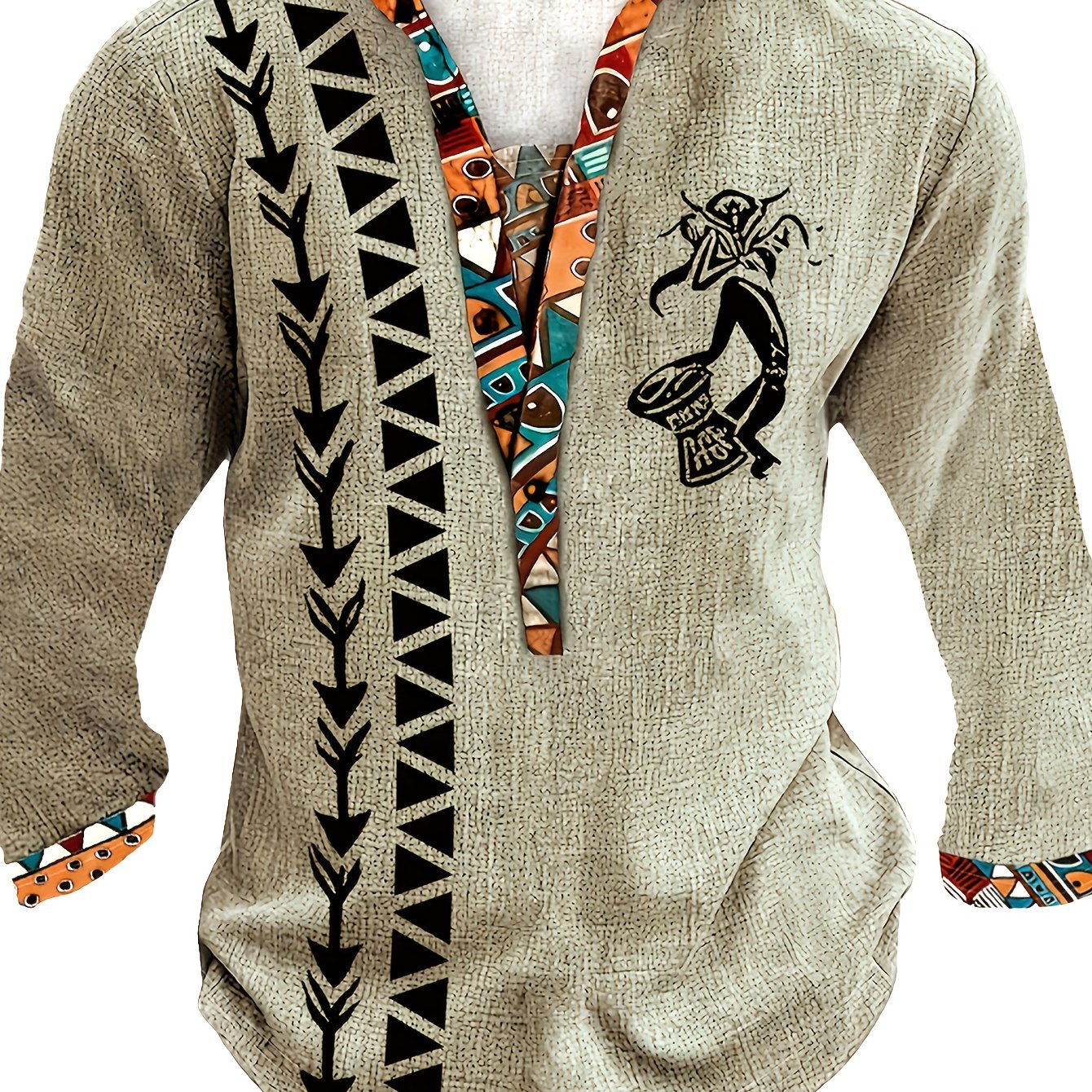 TEMU 남성용 민족적 긴팔 셔츠 - 컬러풀 트라이벌 프린트가 있는 V넥 버튼업, 캐주얼 및 스타일리시한 캐주얼 의상용, 사계절 착용 가능, 캐주얼 웨어 셔츠 | V넥 셔츠 | 버튼업 셔츠