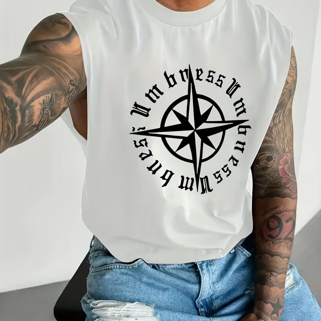 TEMU 남성용 캐주얼 민소매 탱크탑 - 기하학적 나침반 프린트, 화이트 & 블랙 그래픽 디자인, 라운드 넥, 레귤러 핏, 사계절 내내 착용 가능, 그래픽 탱크탑, 여름 의류, 모던 캐주얼웨어, 스트리트웨어 스타일, 가벼운 원단, 캐주얼 워드로브