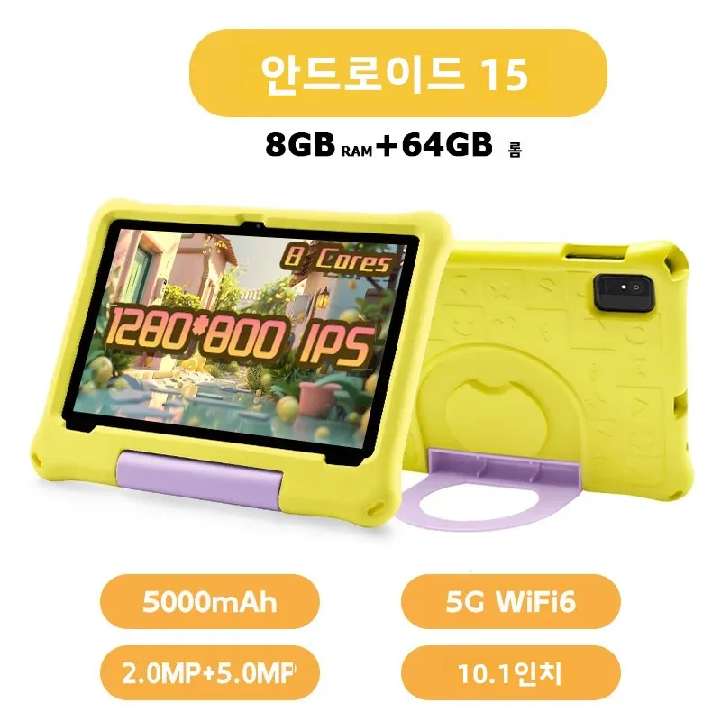 ANRY 10.1인치 키즈 안드로이드 15 태블릿 8GB (4+4GB) 램 64GB 롬 5000mAh 옥타코어 5G 와이파이 어린이 학습 교육용 태블릿