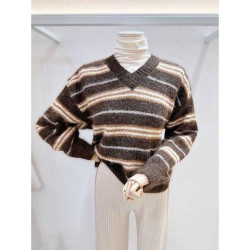 에리페 여성용 돌돌 스트라이프 긴팔 브이 니트