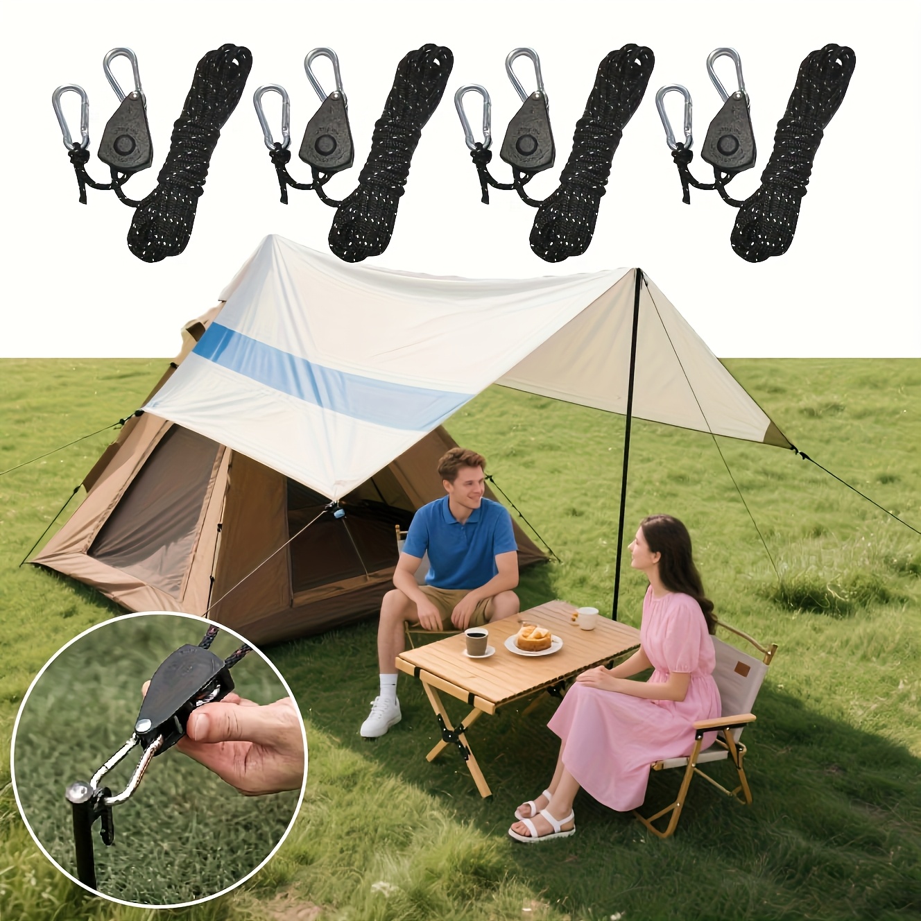 TEMU 4개 세트 헤비듀티 캠핑 텐트 로프 키트 - 쉬운 조임, 방풍 버클, 풀리 래칫, 튼튼한 옷걸이 및 내구성 있는 오너링 후크로 안전하고 편리한 캠핑 경험을 위한 캠핑 액세서리