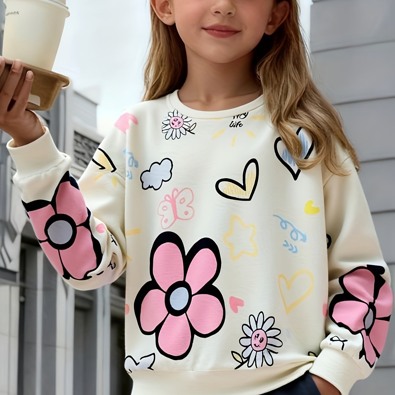 TEMU 여아용 귀여운 꽃무늬 하트 프린트 패션 스웨트셔츠, 폴리에스테르, 라운드 넥, 비탄성, 정규 길이, 긴 소매, 봄/가을 시즌, 루즈핏, 니트 직물, 패드 없음