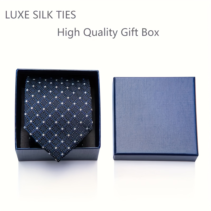 TEMU 고급스러운 블루 실크 넥타이 - 세련된 체크 패턴, 클래식 8cm 폭 남성용 넥타이, 선물박스 포함, 발렌타인데이, 부활절, 아버지날 선물로 완벽 | 드라이클리닝 전용 럭셔리 액세서리 | 우아한 디자인과 내구성