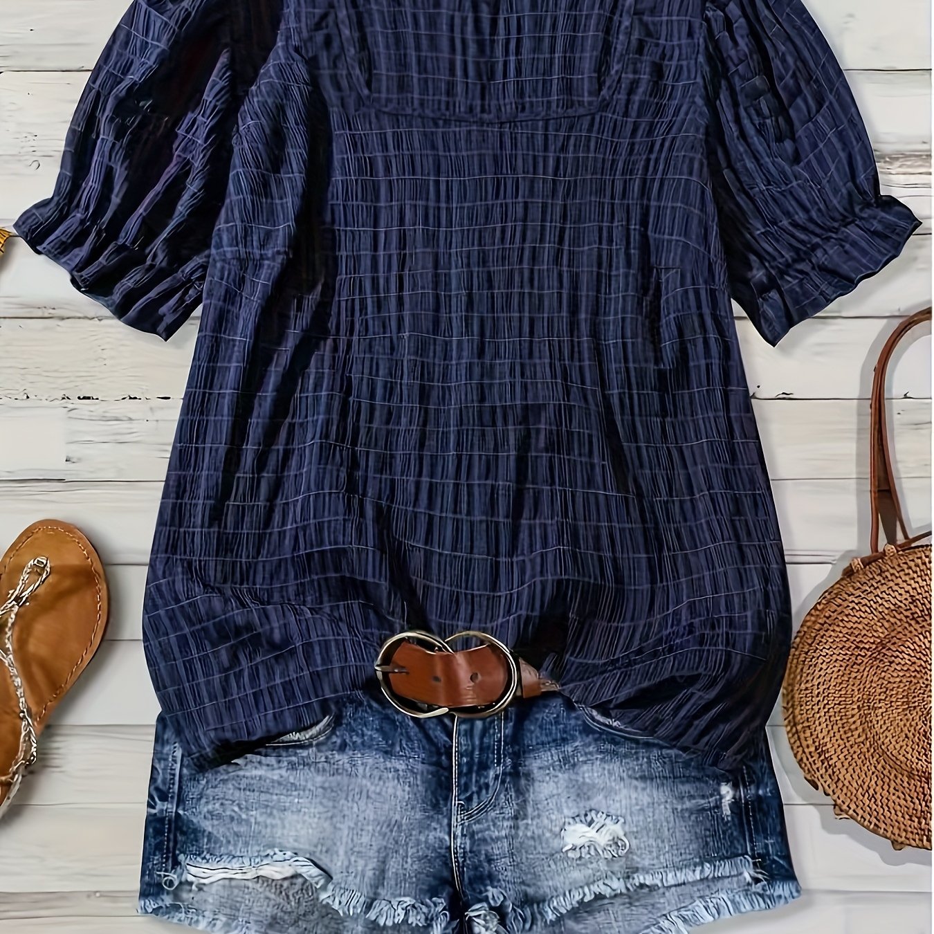 TEMU [원] 방향성 여성용 우아한 스퀘어넥 플리츠 반팔 셔츠는 일상복 및 사무실 출퇴근에 적합합니다.