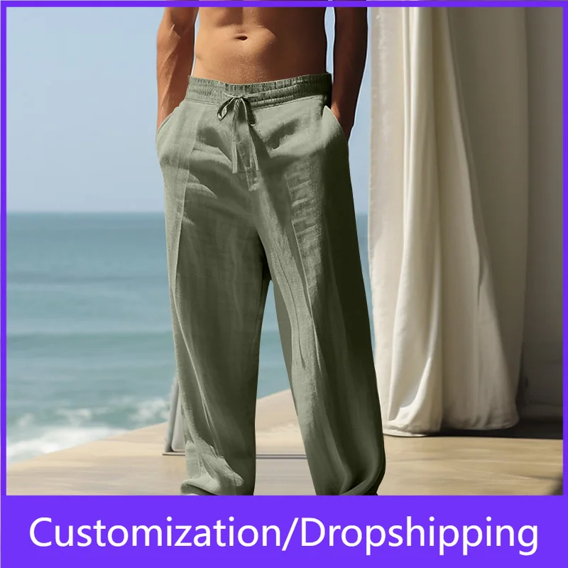 봄 여름 신작 남성용 단색 면 및 린넨 캐주얼 긴 바지, 하와이 해변 루즈한 스포츠 및 통기성 스트리트 패