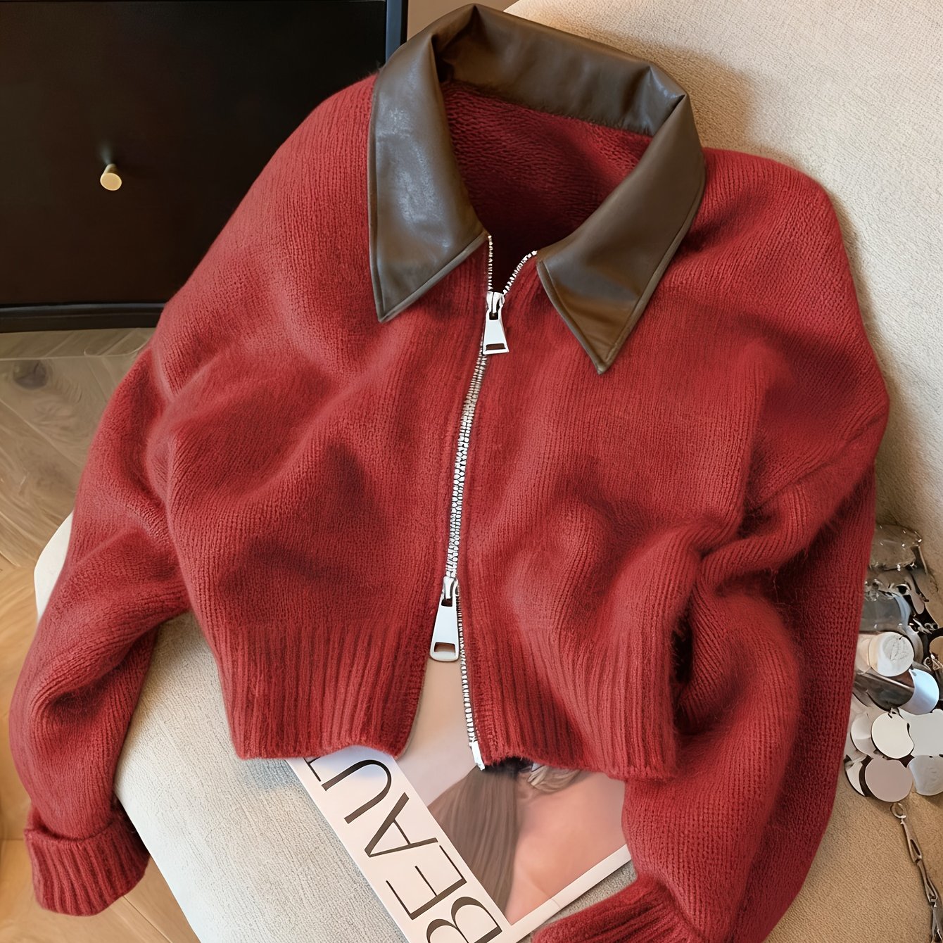 TEMU 2025년 여성 가을 겨울 가디건, 부드러운 라펠 지퍼 스웨터, 컬러 블록 디자인, 긴소매, 드롭 숄더, 약간의 스트레치, 우아한 스타일, 레귤러 핏, , 가을 겨울 여성 상의